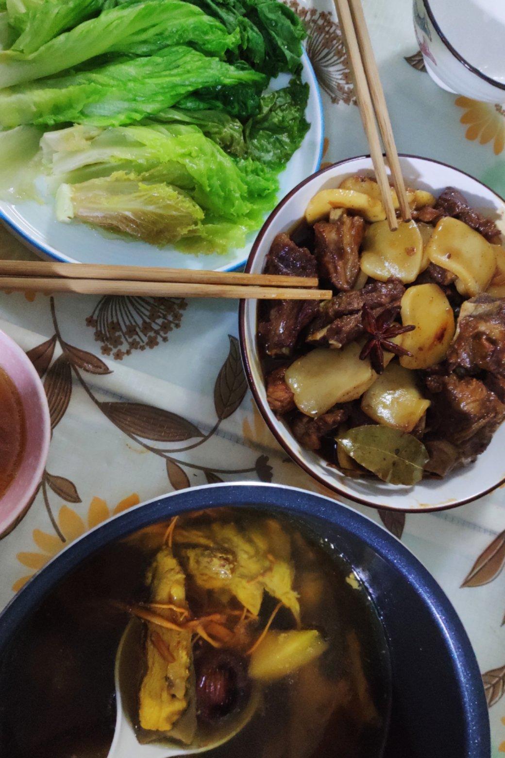 嗯~ 好久不在家做饭了。今天来个虫草花炖汤煮面+凉拌黄瓜