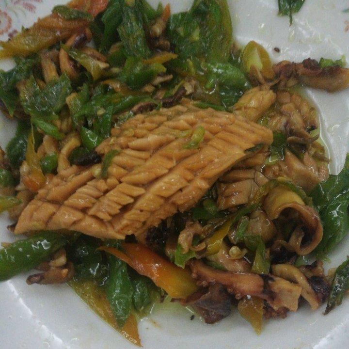 姜少许孜然少许用油爆香后倒入鲜鱿鱼翻炒,加蚝油酱油翻炒后加彩椒丝洋葱丝翻炒片刻出锅