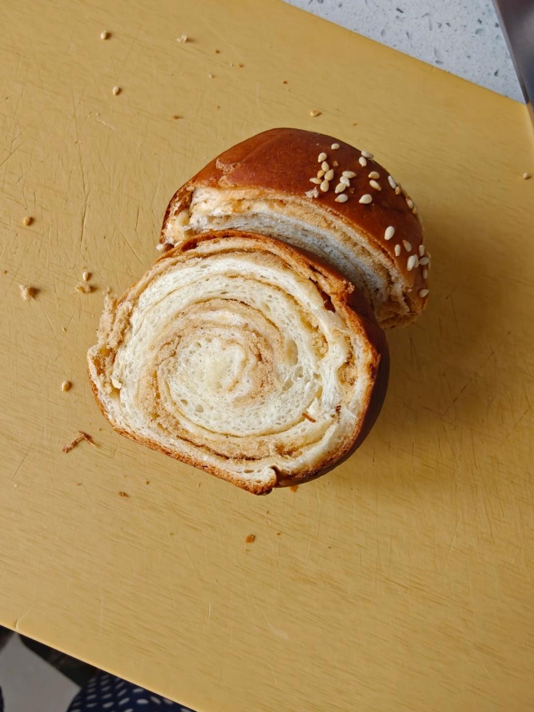 香香软软的非常好吃😋,太适合秋天了。配方来自小屁妈妈,加了10克面粉,用的后酵母法,180度烤了8分钟以后盖的...