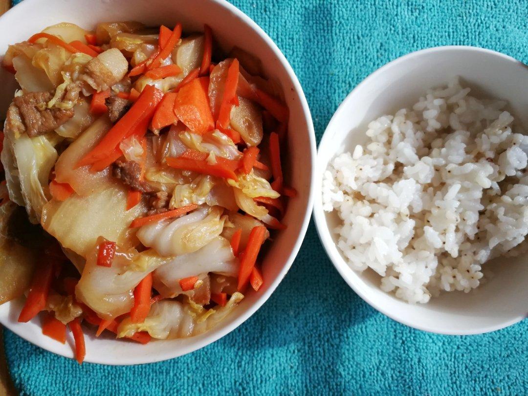 胡萝卜白菜炒五花肉(醋,生抽,蚝油),二米饭(大米+高粱米)
