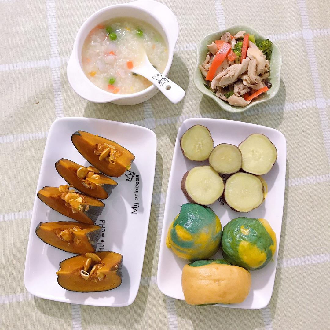 虾仁南瓜粥,红薯,贝贝南瓜,凉拌鸡肉,手工馒头