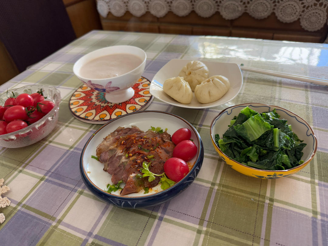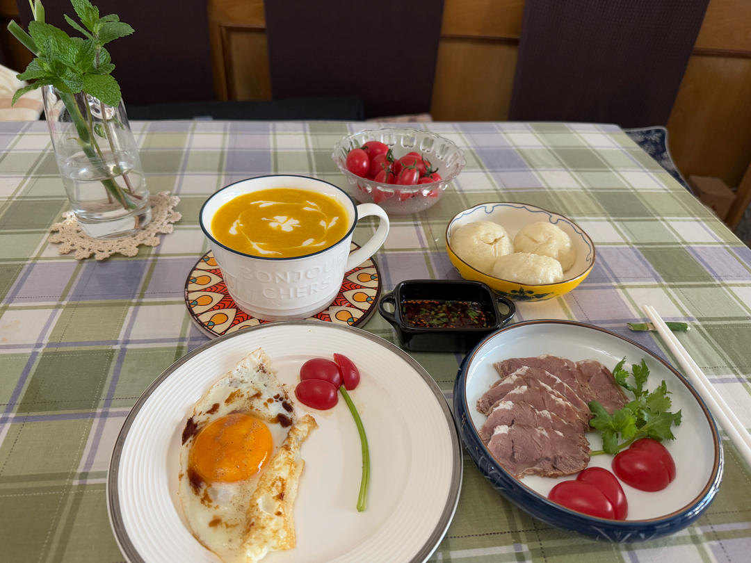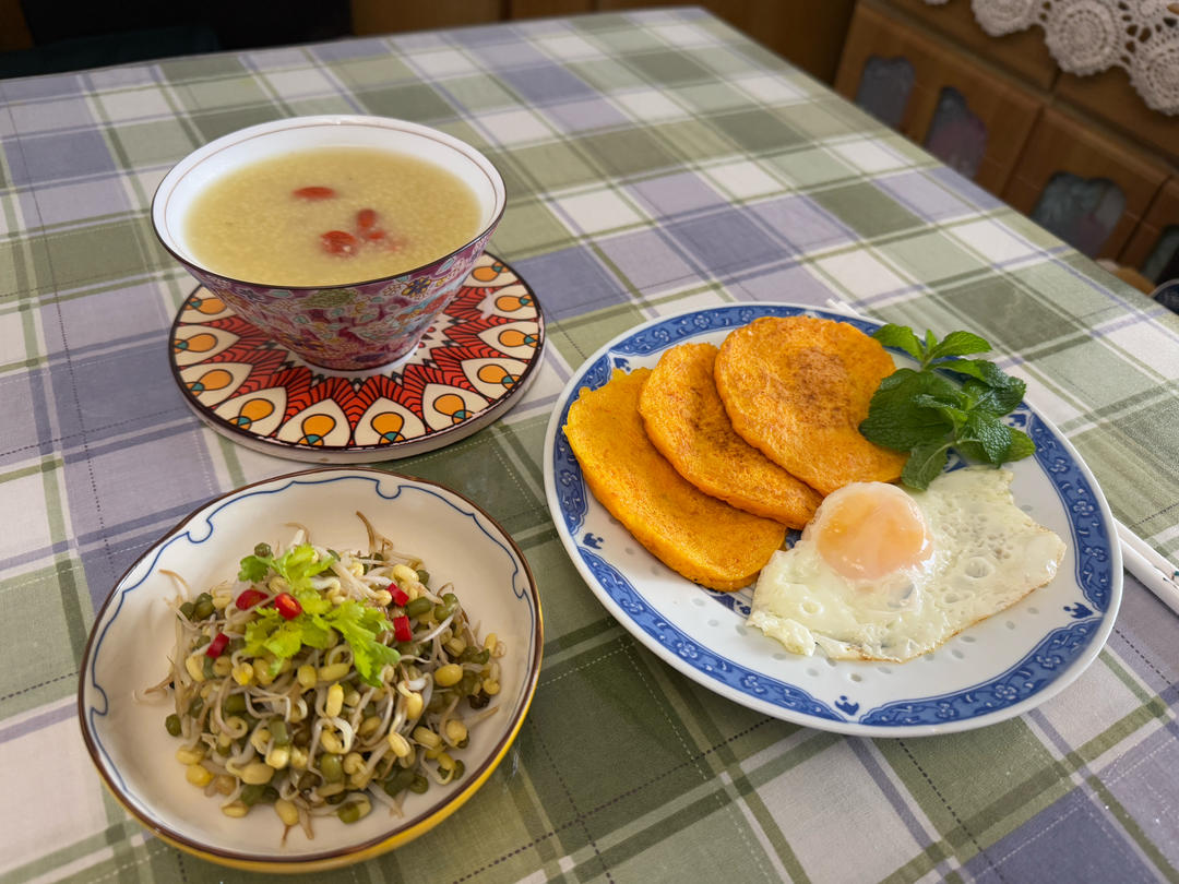 今日早餐:番茄土豆球,西红柿烤蛋,绿豆米糊黑芝麻杯子蛋糕#早餐•2023...