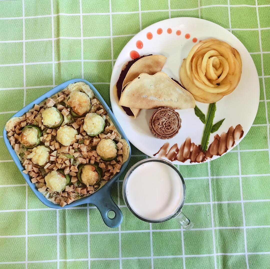 今日早餐:丝瓜蒸蛋,紫薯饼+巧克力椰蓉月饼,桃子玫瑰,热牛奶#营养早餐🌸🌼🍀...