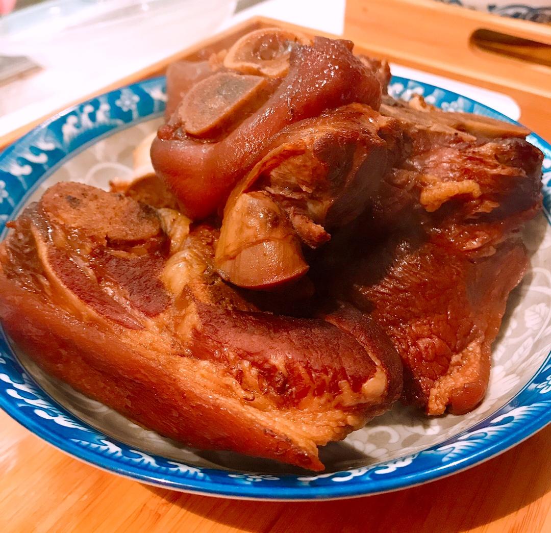 酱猪肘(超喜欢!)+香煎肉馅藕饼+煎饺+蔬菜疙瘩汤