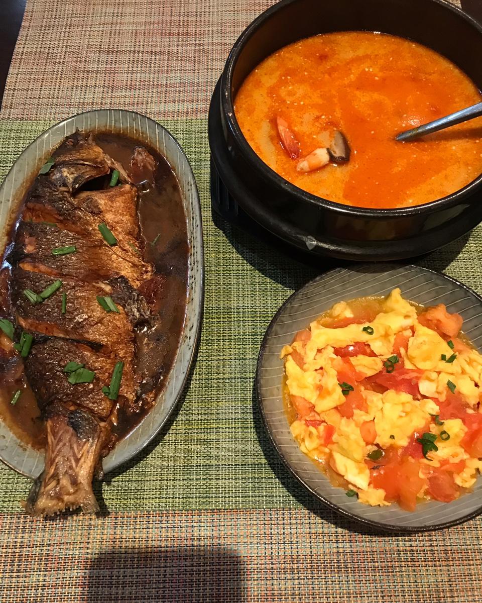 红烧鲈鱼、冬阴功汤、西红柿鸡蛋。休了两个礼拜病假我瘦了五斤娃瘦了三斤,今天回来开始吃自己做的...