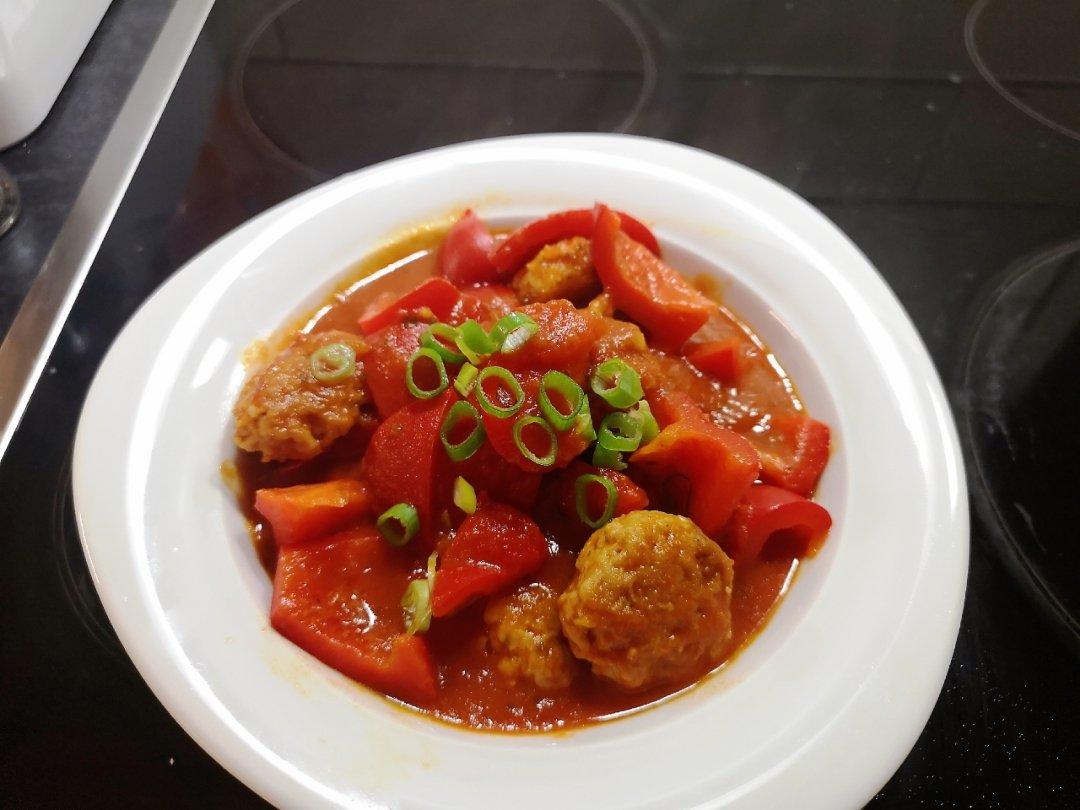 彩椒鸡肉丸,紫菜蛋花汤。鸡肉丸用鸡肉馅现做的,煎至里面金黄后加彩椒炒,然后加罗勒西红柿酱焖...