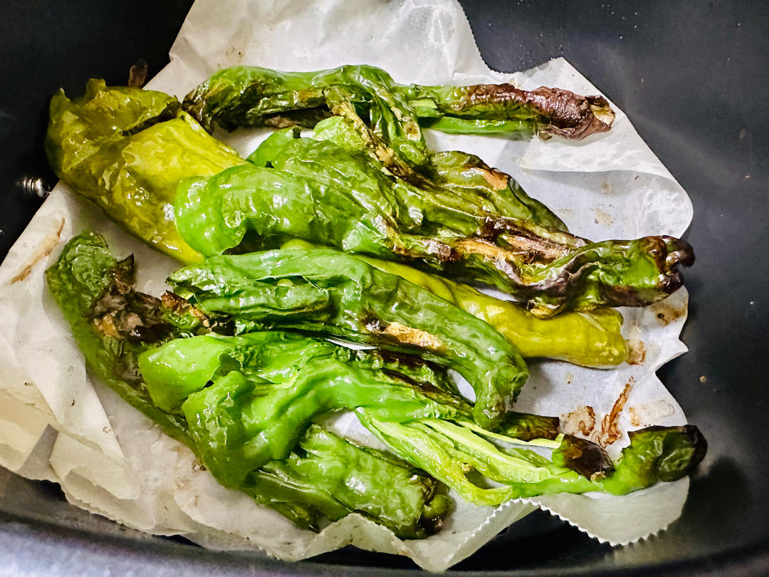 我的做法➨选不辣的肉厚一点的青椒,去籽切开,放铁锅里小火炕到软趴趴、表皮焦黑,撕...