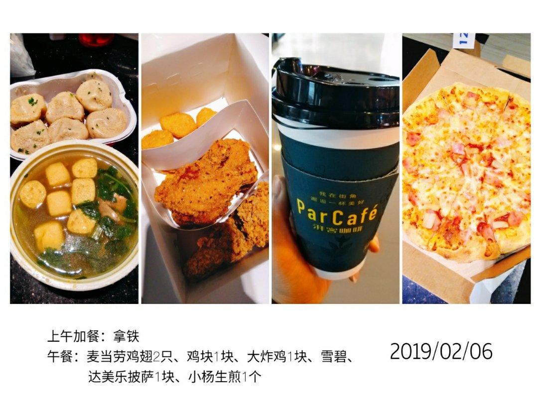 午餐:麦当劳鸡翅2只、鸡块1块、大炸鸡1块、雪碧、 达美乐披萨1块、小杨生煎1个#午餐•2019年2月7...