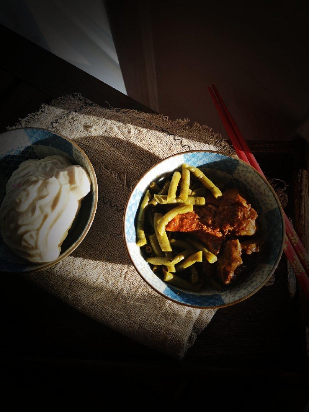 一人食~酸豆角烩排骨~老妈给了几个小鱼馒头~好看又好吃~😍😍
