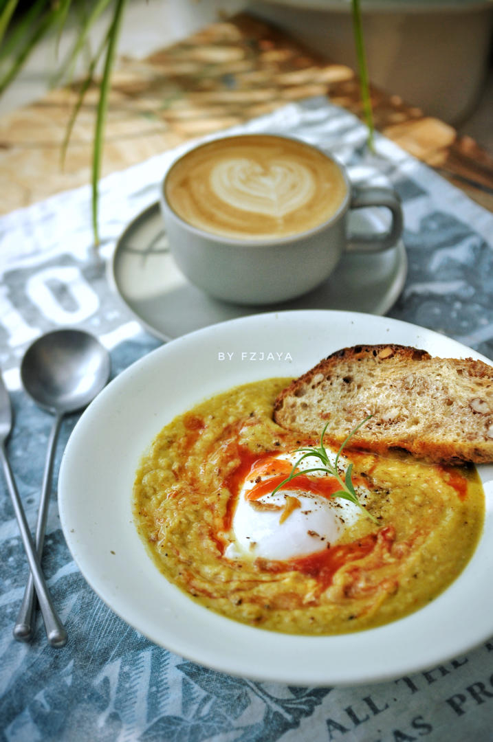 前一晚的剩菜,蒜苗腊肠炒芋头,再加蒸熟的南瓜和牛奶,一起打成浓汤,加点咖喱粉调味,窝个水波蛋,蘸欧包吃,巴适#享瘦生活!...