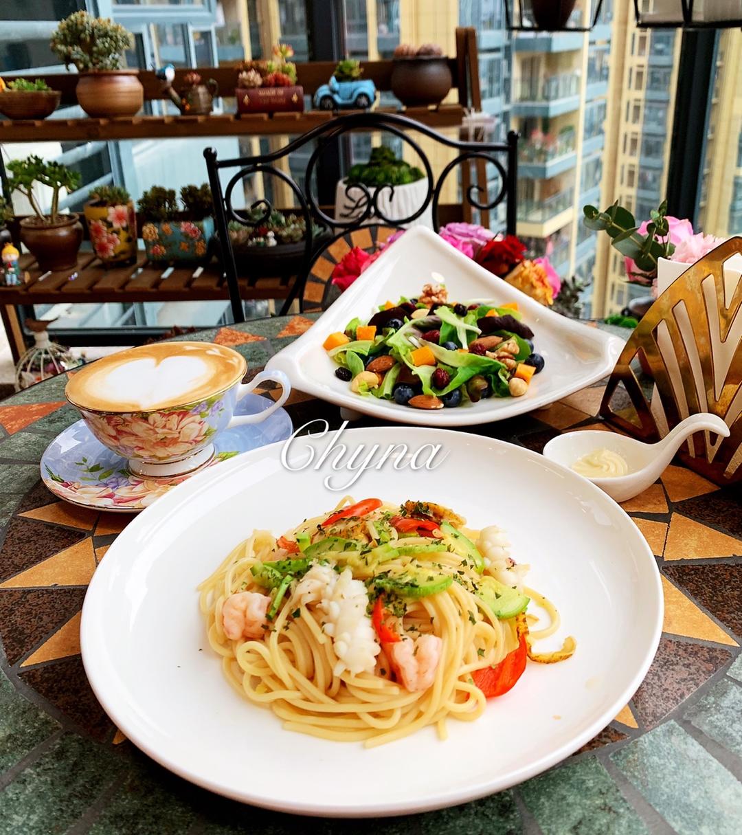 早上好!今天早餐吃海鲜意面,拿铁,生菜沙拉。