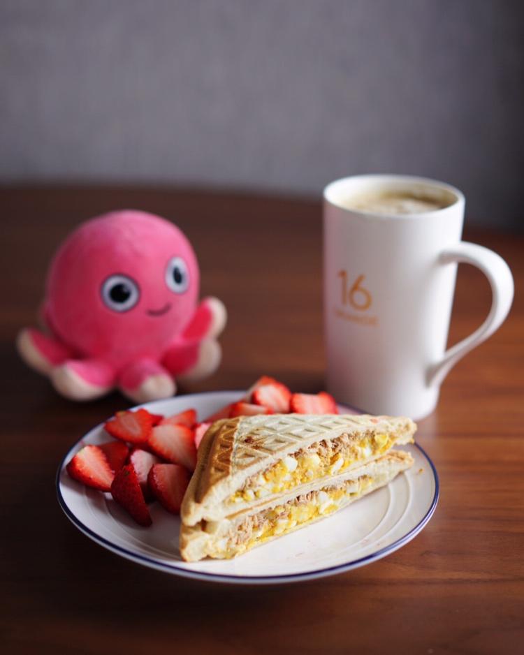 早安/今日份早餐:金枪鱼鸡蛋沙拉三明治,草莓,拿铁