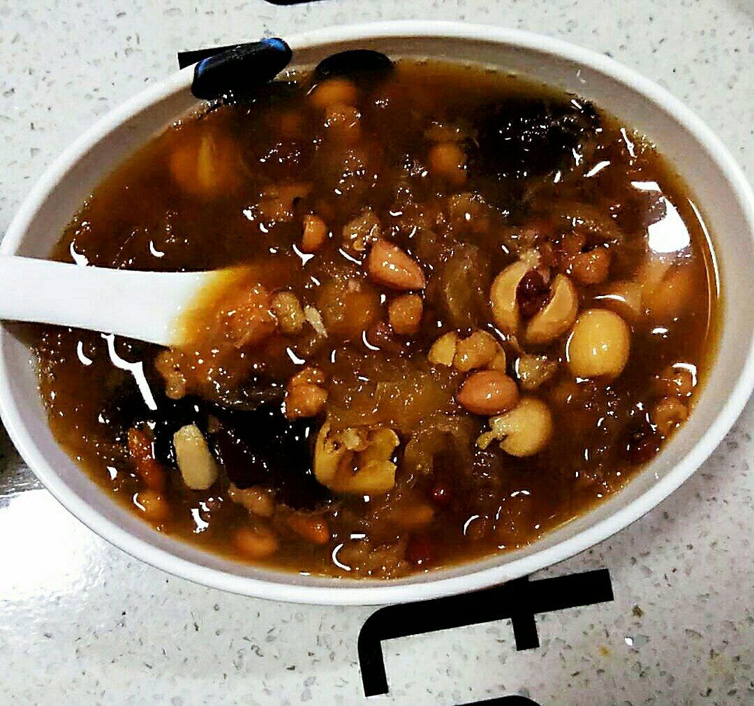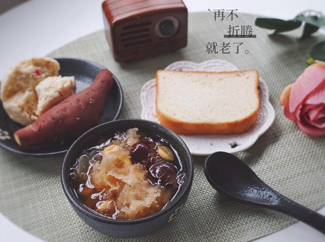 今日早餐:银耳红枣莲子桃胶汤+面包+红薯🍠+包子,甜甜的早餐,吃完心情美美哒!