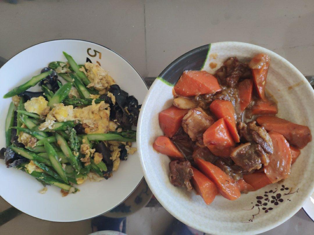胡萝卜炖羊排,鸡蛋炒芦笋木耳。水果甜杏,毛桃。二米饭。今天算了一下,居然还剩7天了。