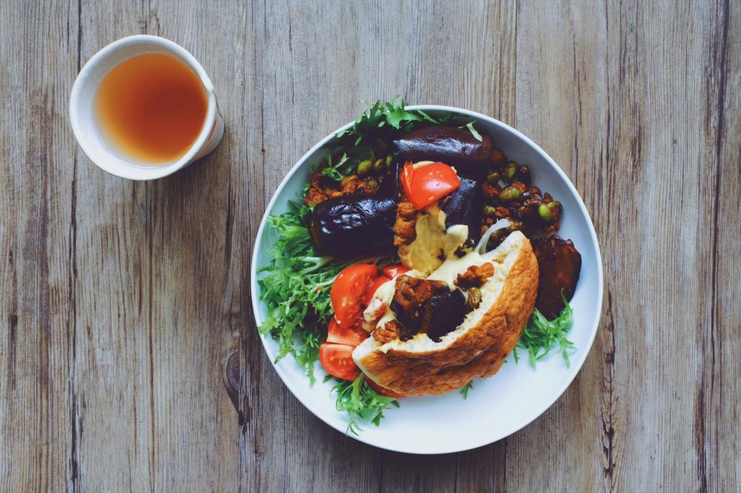 毛豆炒茄子,装进皮塔饼和鹰嘴豆泥一起吃