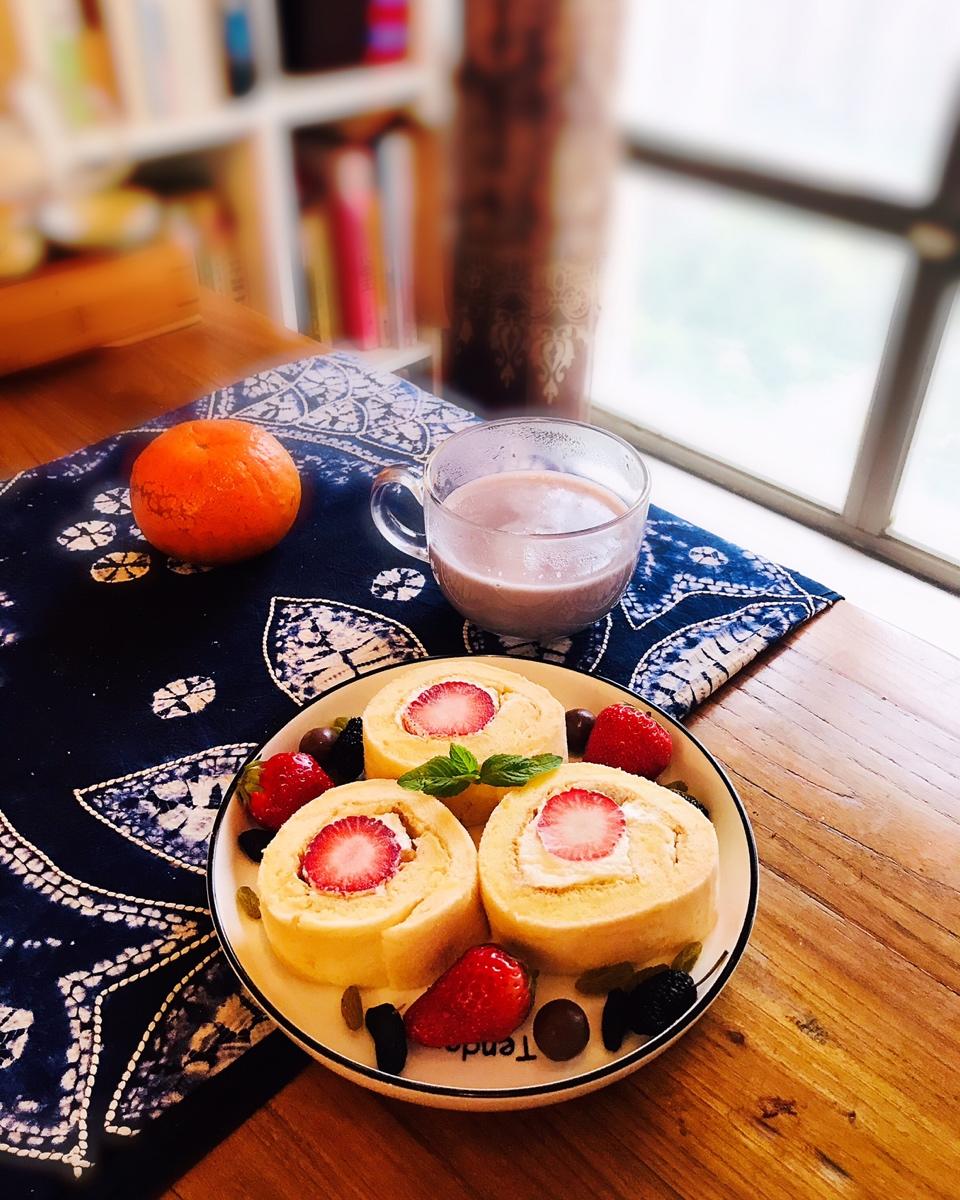 草莓蛋糕卷 黑豆花生豆奶 水果