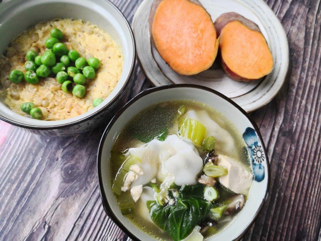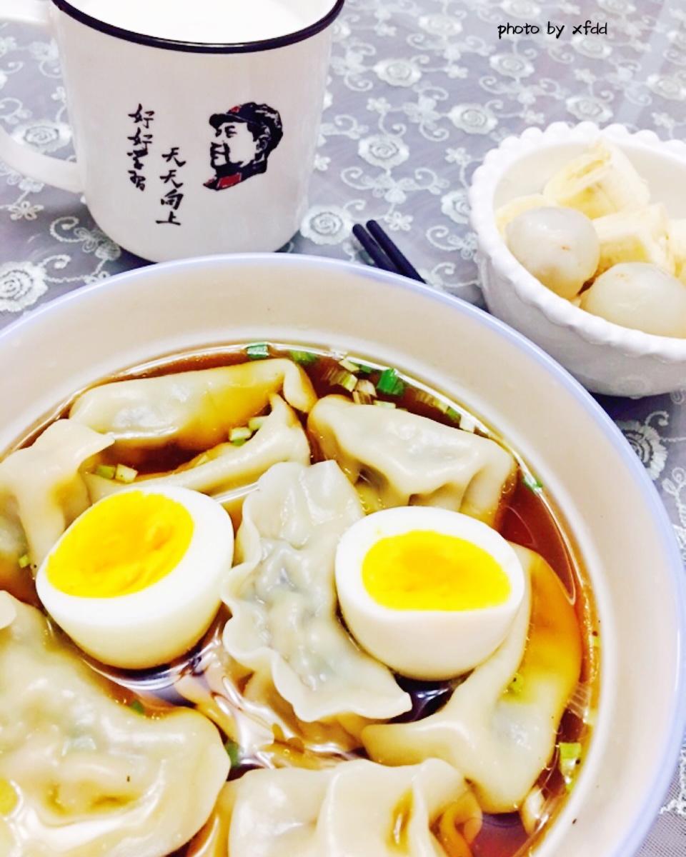 今日早餐:猪肉芹菜水饺+白煮蛋+香蕉荔枝+牛奶🥛