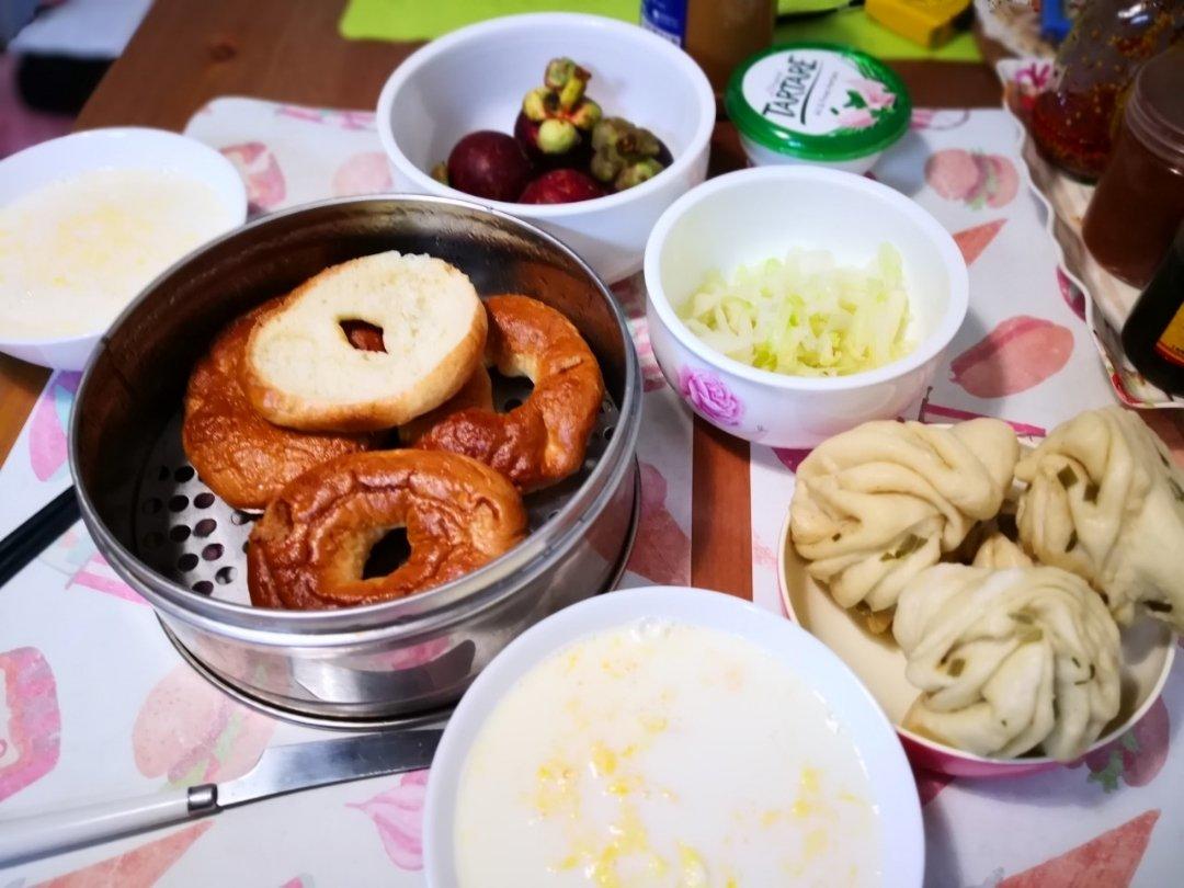 5.14的早上有点丰富,不过花卷主要是热下作为中午的主食~~重点其实就是贝果+牛奶鸡蛋+山竹+拌圆白菜~~#早餐•201...