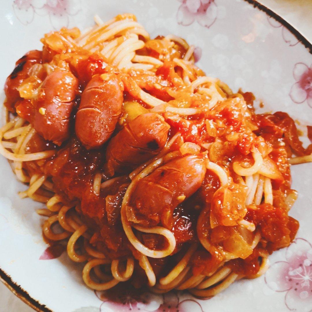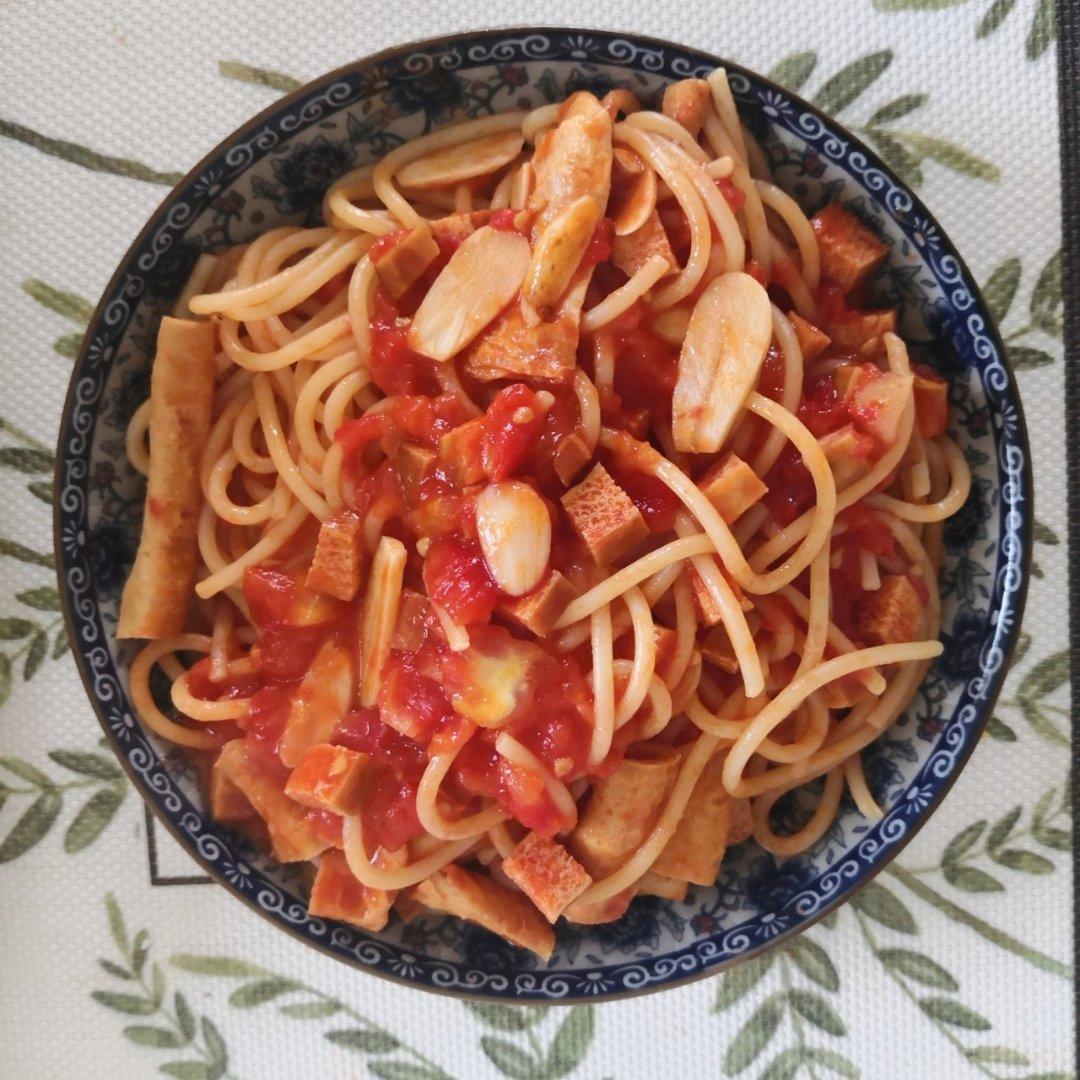 一直在想纯的番茄意面跟什么加在一起口感会丰富一些,今天加了一些炸腐皮,还不错。没有摆盘杂乱美好了。