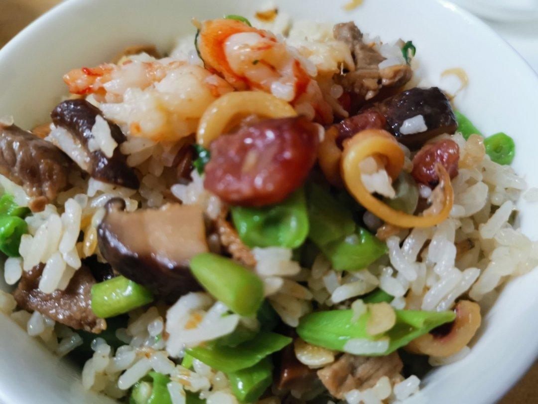 材料:蝦仁+香菇+蝦皮+魷幹+臘腸+豬肉+豆角+瑤柱雞湯凍