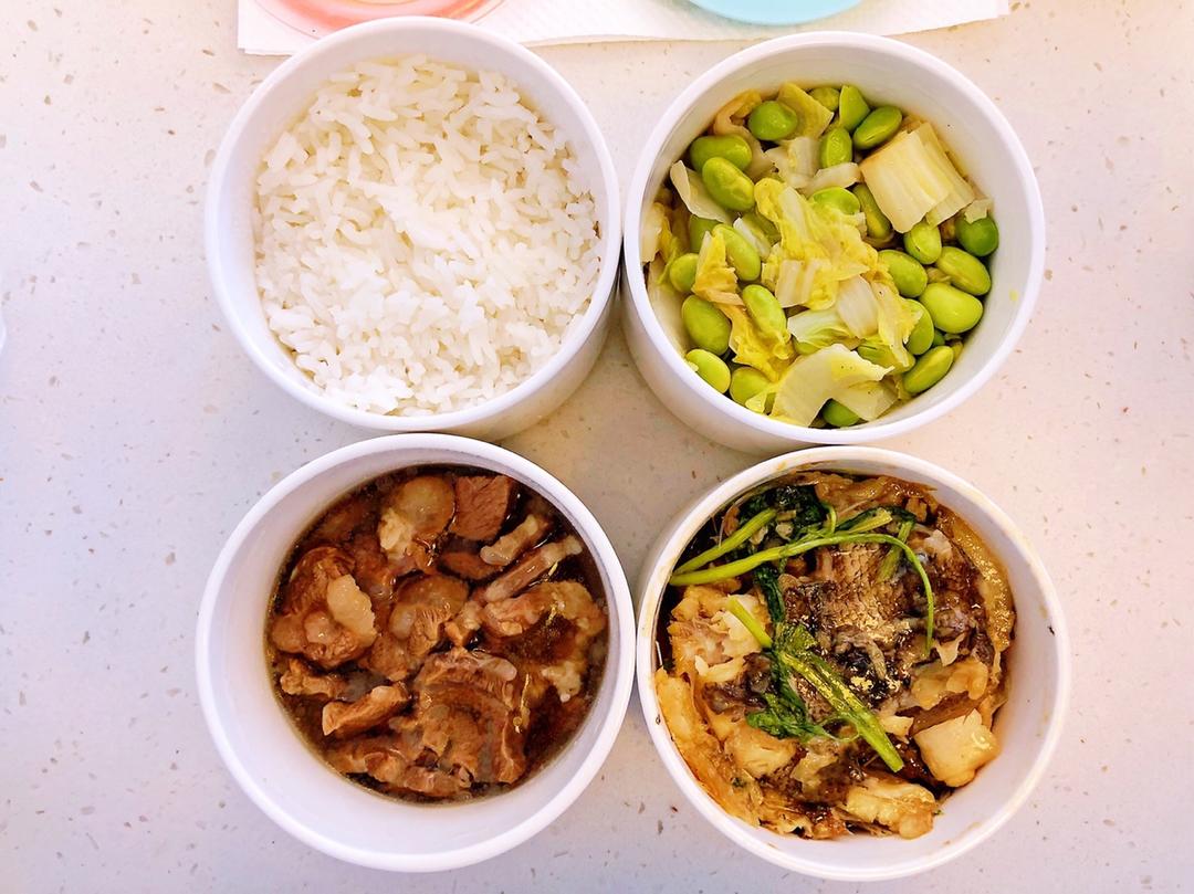 米饭。毛豆炒娃娃菜。焖烧龙舌鱼(香菜很重要!)。牛肉高汤。