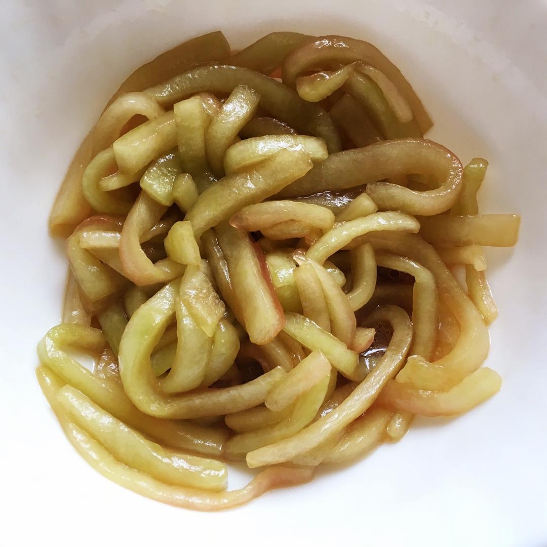 半个8斤瓜的皮,先用盐抓了腌制15分钟,然后洗干净过凉白...