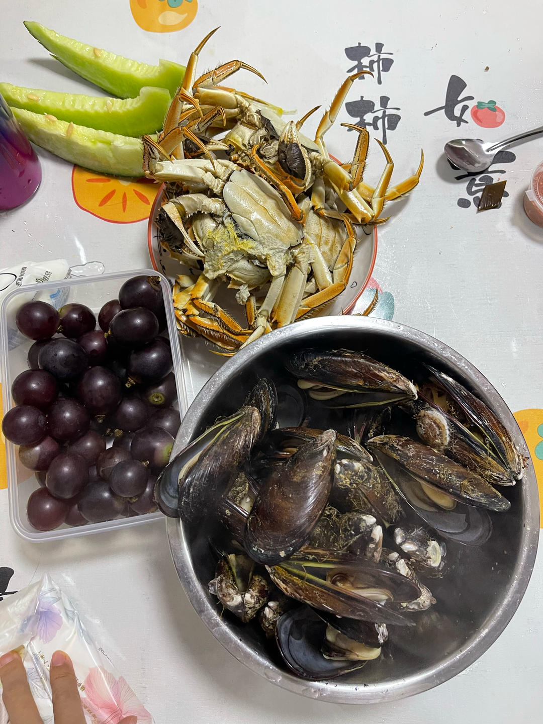 室友姐姐在早市儿买的海鲜,室友妹妹切的瓜,这个螃蟹真不小,海虹...