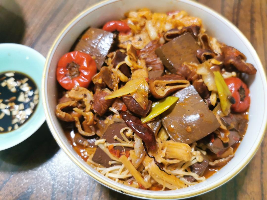 剩下的肥肠鸭血,加了火锅底料和郫县豆瓣炖了一锅,好吃快手又下饭。