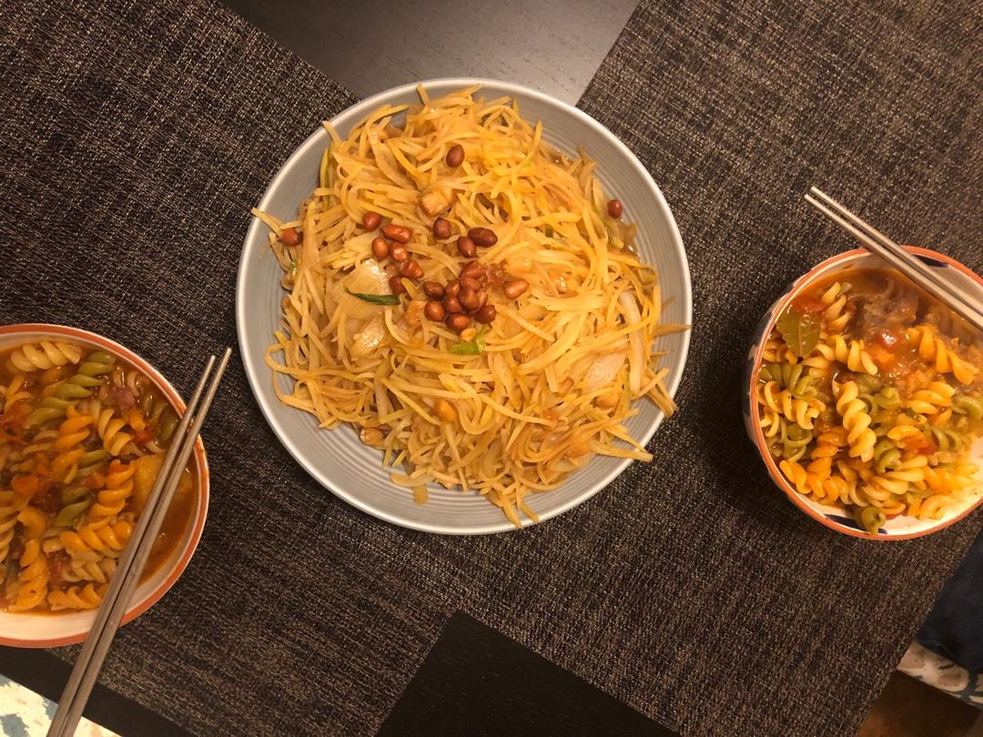 10/25晚餐: 扇贝柱炒土豆洋葱丝、番茄牛腩pasta