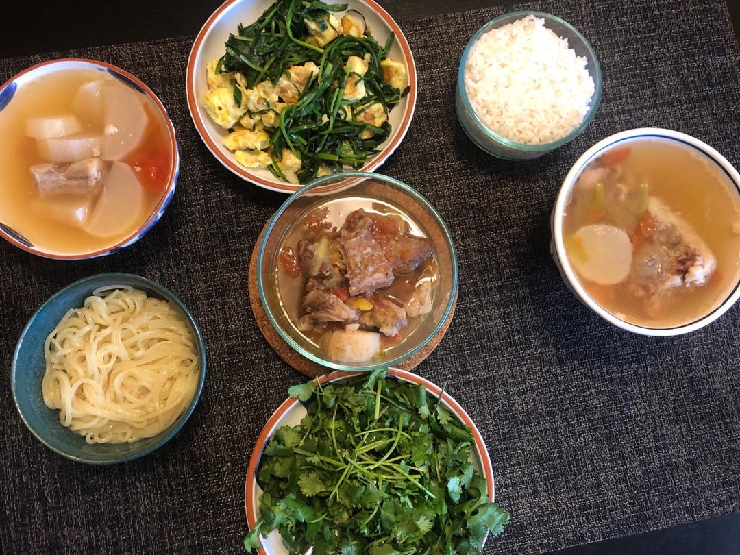 10/23Wed午餐:牛尾骨汤、番茄炖牛腩、韭菜炒鸡蛋、凉拌香菜