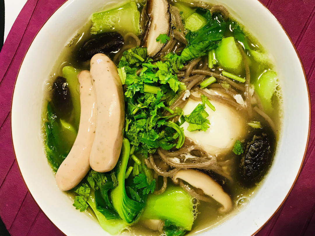 午饭好了,荞麦面条,里面放了香菇、油菜,荷包蛋和刚买的鸡肉肠[憨笑]