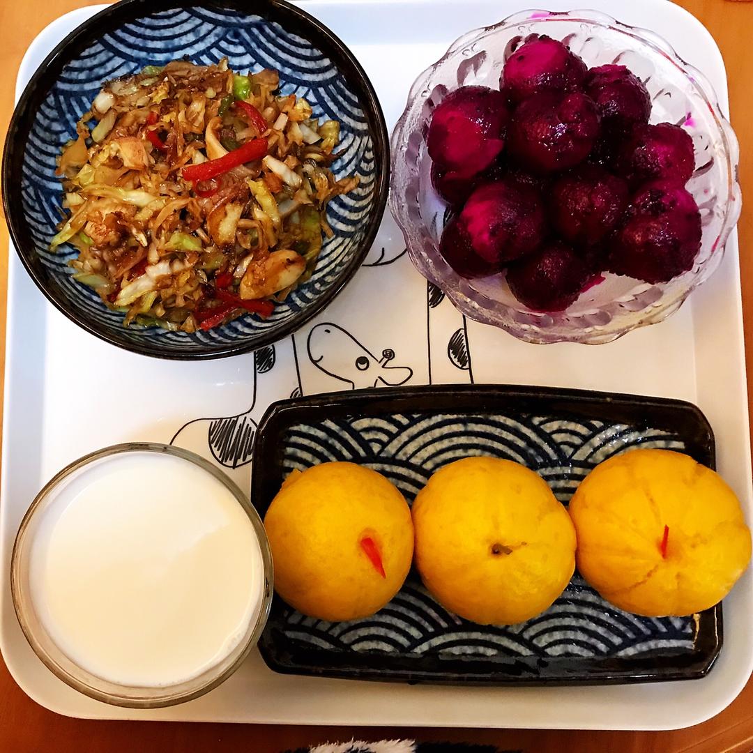 南瓜馒头➕炒卷心菜➕牛奶🥛➕红肉火龙果