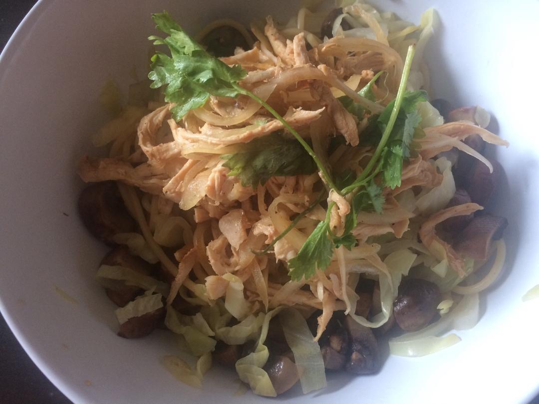 之前用洋葱丝做的凉拌鸡丝来拌面~煮面时顺便煮了蘑菇和包菜条。意面做拌面真蛮好吃的,弹牙爽滑(时差党意面好买便宜大份)(不...