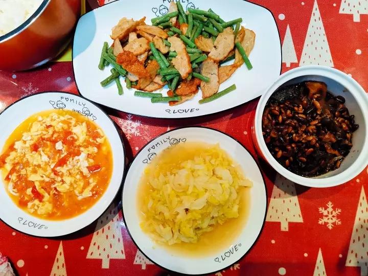 冰箱里过年存货不多了,做了爸爸最爱吃的猪尾巴焖黑豆、肉条炒豆角、西红柿鸡蛋、蒜蓉白菜。爸爸吃得很开心💑 #午餐·202...