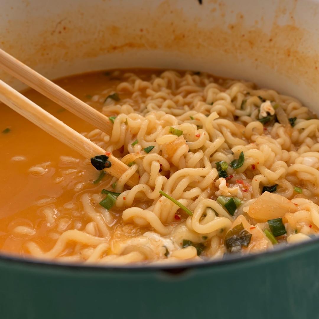 其实就是一碗高级泡面😂卷心菜,午餐肉,五花肉,老豆腐,面饼,加上自制泡菜,芝士!哄抢!