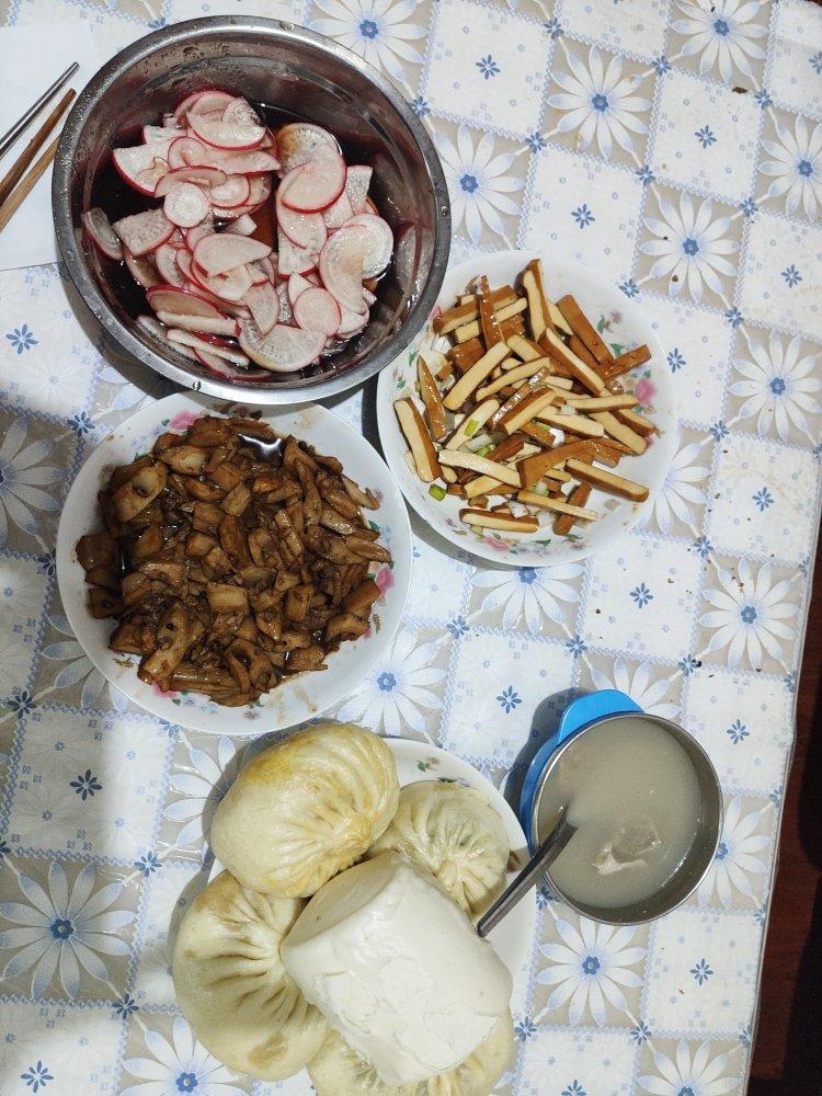 葱拌豆腐干,肉末炒藕,糖醋小萝卜,羊汤和包子,组合在一起很奇怪吧