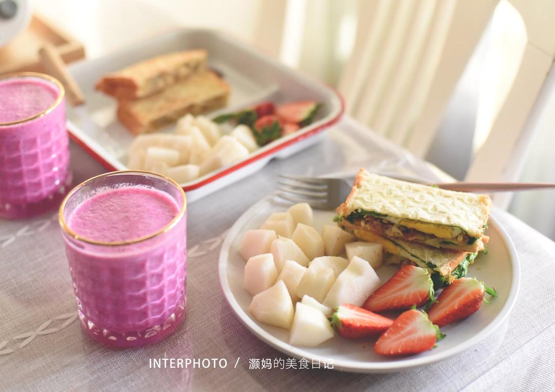 鸡蛋肉沫三明治+花生酱香蕉三明治+火龙果香蕉奶昔+水果