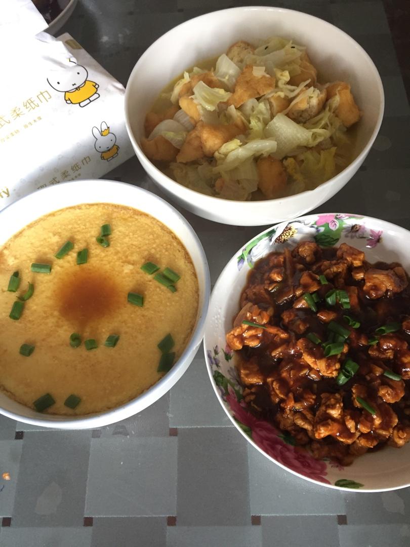 菜不够,蛋来凑!红烧鸡胸肉花、大白菜油豆腐、水蒸蛋