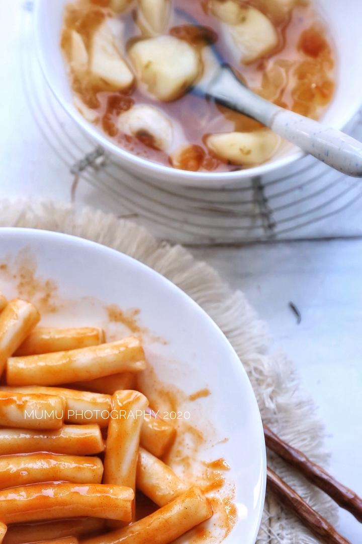 马蹄桃胶糖水,辣酱年糕。买的韩式辣酱,水开后下年糕条煮几分钟盛出拌辣...