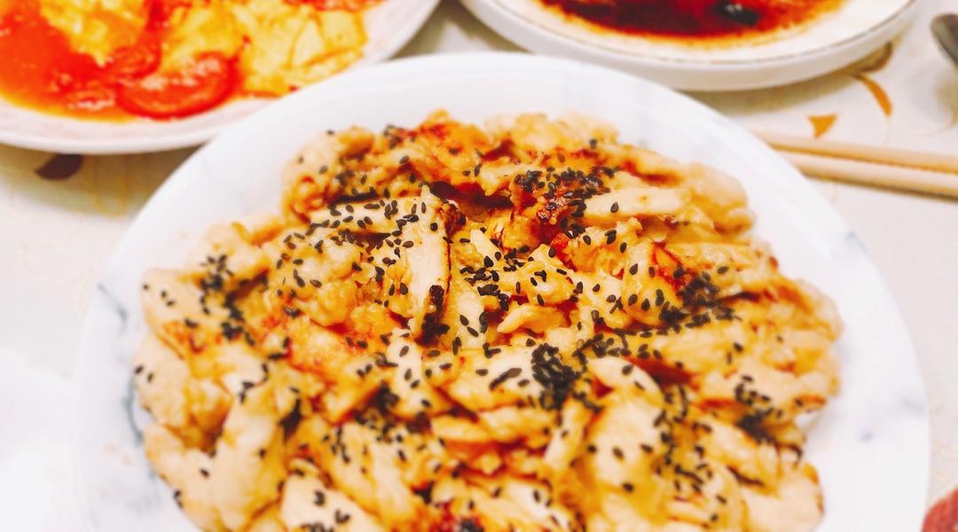 今天面太稀了,葱油饼不太成型,土豆蒸熟加淀粉和面塑形,再蒸熟调汁,工序有些费劲,麻辣凉拌鸡丝+炸蘑菇#晚餐·2020年2...