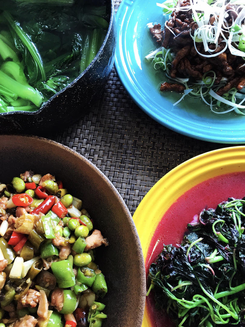 今天的:蒜茸苋菜、京酱肉丝、双椒兔、芥菜汤