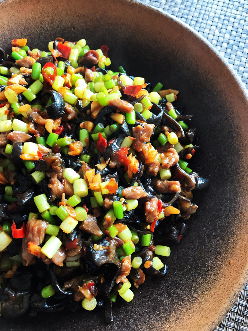 又到蒜苔季,切丁和木耳丝、牛肉碎一起炒一盘鱼香碎滑肉😋