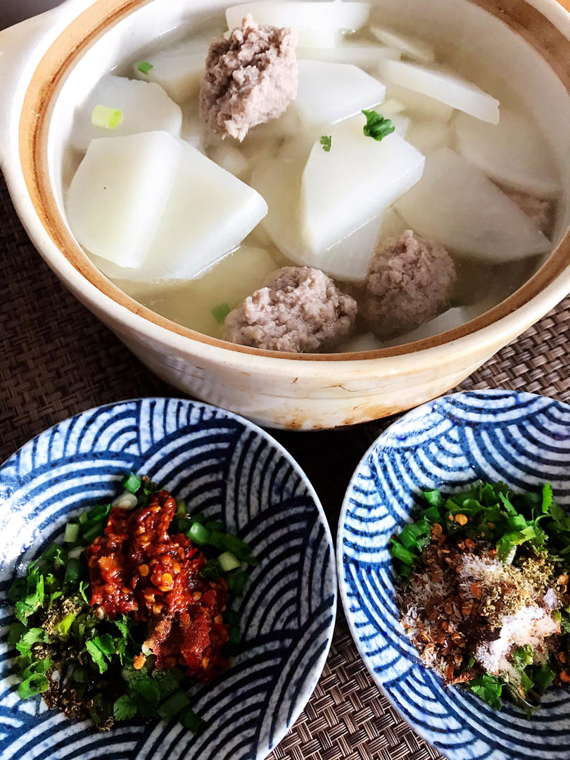 一钵山萝卜圆子汤,做两个不同的蘸碟,一个农家豆瓣酱一个贵州糊辣椒,加上香葱芫荽少许盐味精花椒面,...