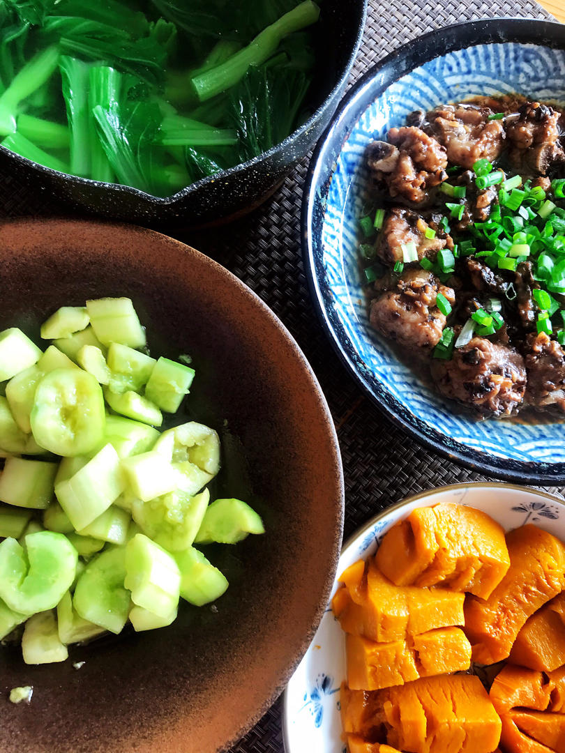 最近的午餐素菜是主角:糖醋黄瓜🥒、蒸南瓜🎃、芥菜汤🥣和豉汁蒸排骨