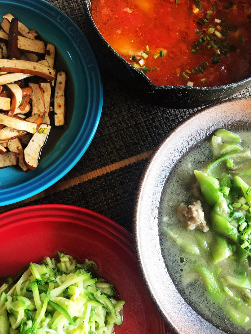 凉拌豆干、清炒南瓜丝、丝瓜烧圆子、番茄巴沙鱼