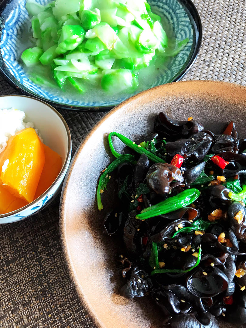 节后的清脂餐:素炒儿菜和芝麻木耳拌菠菜