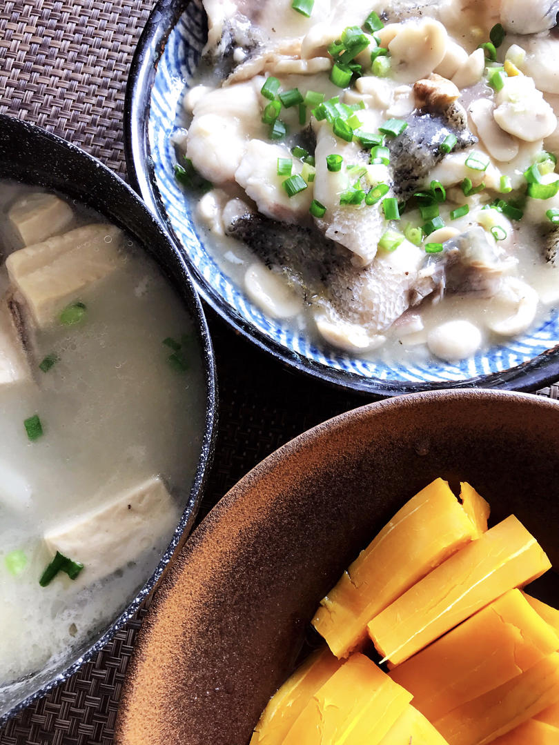 今日份午餐:黑椒口蘑乌鱼片、鱼骨豆腐汤、蒸南瓜🎃