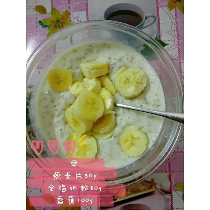 香蕉泡燕麦牛奶:纯燕麦片50g、全脂奶粉30g、去皮香蕉100g