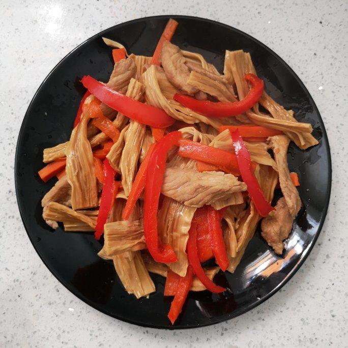 提前两小时泡腐竹同时腌肉(姜粉生抽老抽蚝油淀粉)。这回不放油,直接把一碗水加料酒煮开,依...