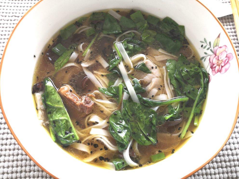 上次烤全鸡剩下的鸡肉,放入砂锅里,加入香菇,切面,青菜叶,就是一锅完美的鸡肉汤面。我放的是莴笋叶,稍带苦味,还放了一根葱...